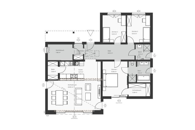 Der Now 131 Bungalow bietet ausreichend Platz und Privatsphäre für alle Bewohner. Der offene Koch-, Wohn- und Essbereich lässt keine Wünsche offen und garantiert eine gemütliche Atmosphäre. Auch ausreichend Platz für Rückzugsorte ist gesichert.
