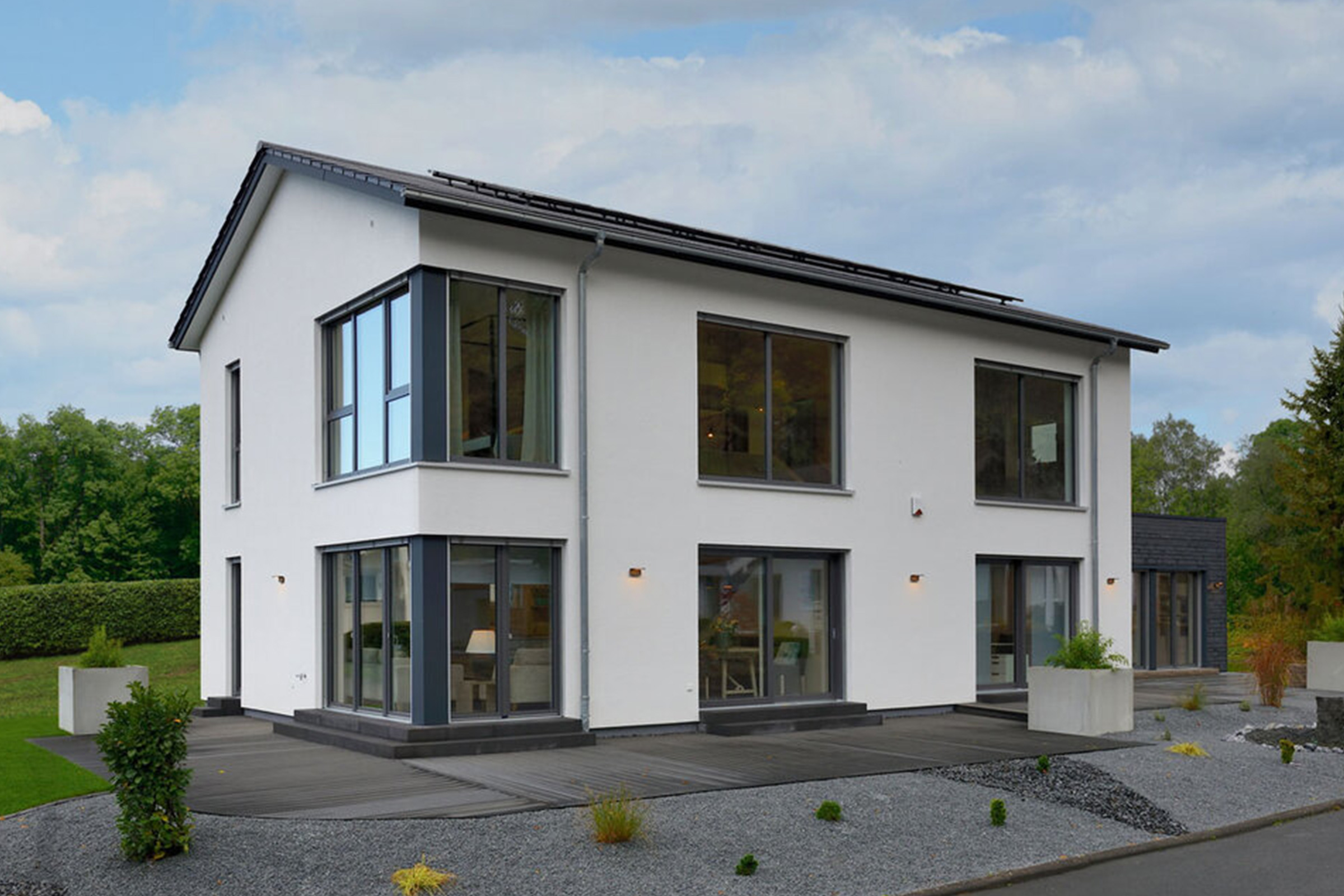 Das ELK Musterhaus 231 zeigt, wie modernes Wohnen heute gedacht wird: Großzügige Fensterflächen und eine offene Galerie schaffen ein lichtdurchflutetes Raumgefühl. Zwei Vollgeschosse bieten viel Platz und Flexibilität für das Leben einer Familie.